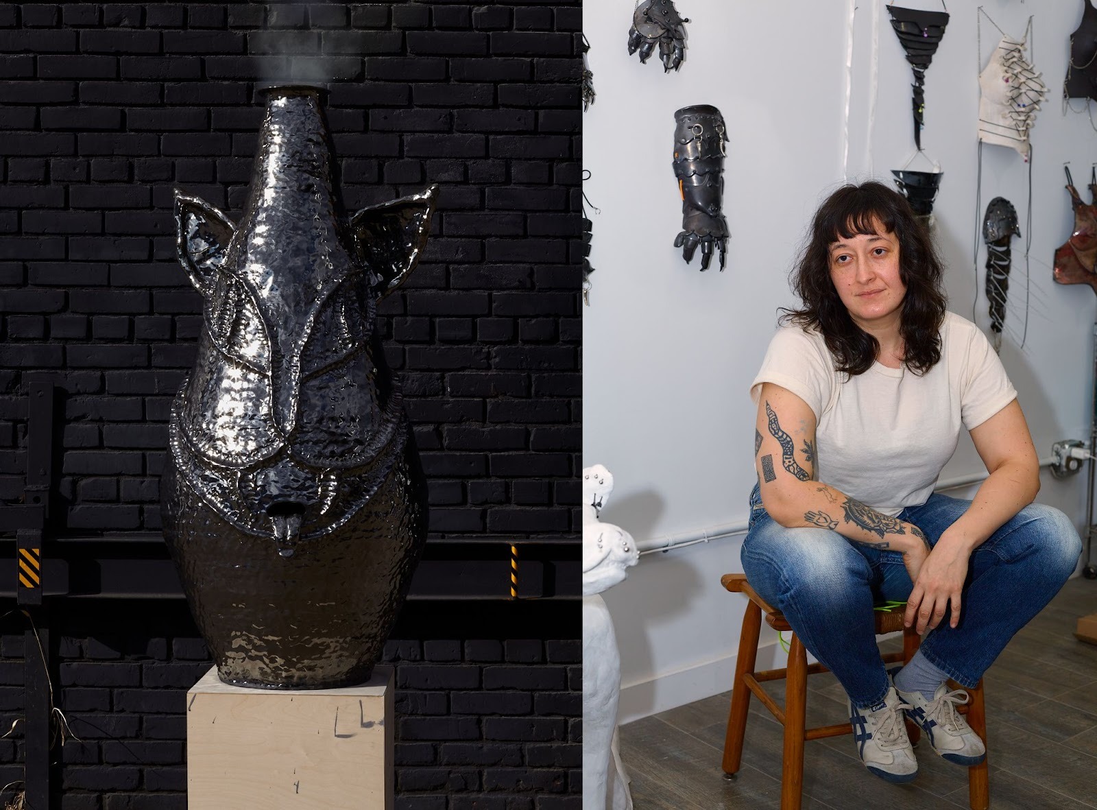 Left: Chloe Seibert, Incinerator, 2026. Glazed stoneware. Right: Portrait of Chloe Seibert by Emma Levesque.