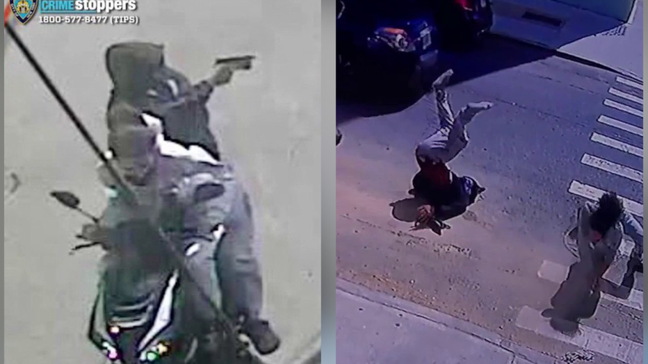 Police said the suspects fled on the moped and crashed minutes later near Manhattan Avenue and Siegel Street while riding the wrong way. Surveillance video shows the pair being thrown from the vehicle before getting back on and continuing to flee.