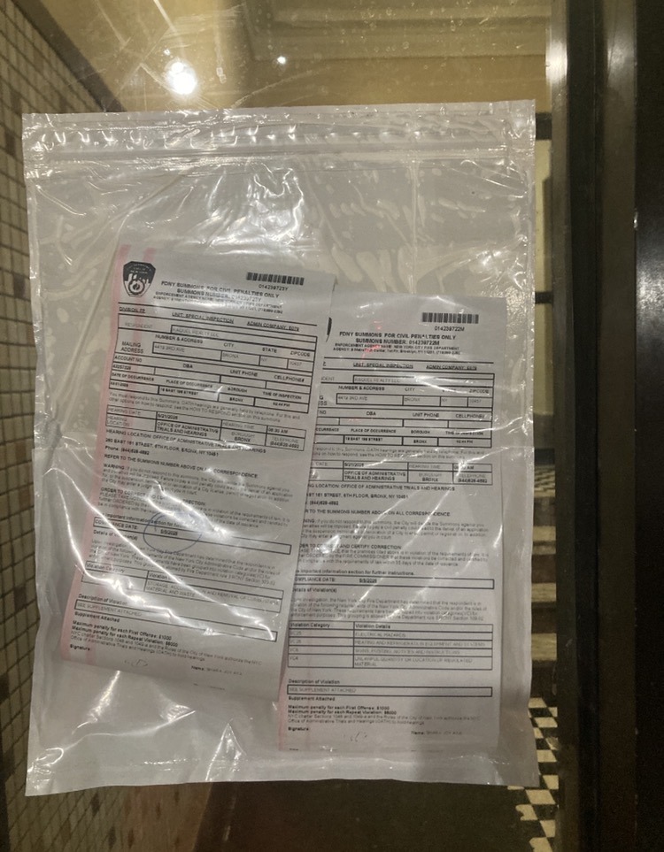 A DOB summons and penalty notice was also seen affixed to the door addressed to the respondent “Raquel Realty LLC.” An FDNY summons and penalty notice was also affixed to the door in respect of the property.