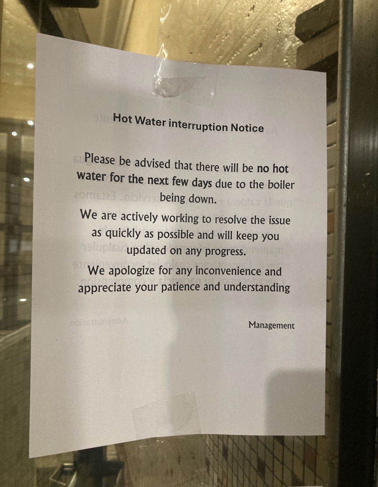 A visit to the building on Friday night found notices in English and Spanish affixed to the door which read, “Hot Water Interruption Notice, Please be advised there will be no hot water for the next few days due to the boiler being down. We are actively working to resolve the issue as quickly as possible and will keep you updated on any progress. We apologize for any inconvenience and appreciate your patience and understanding. Management.”