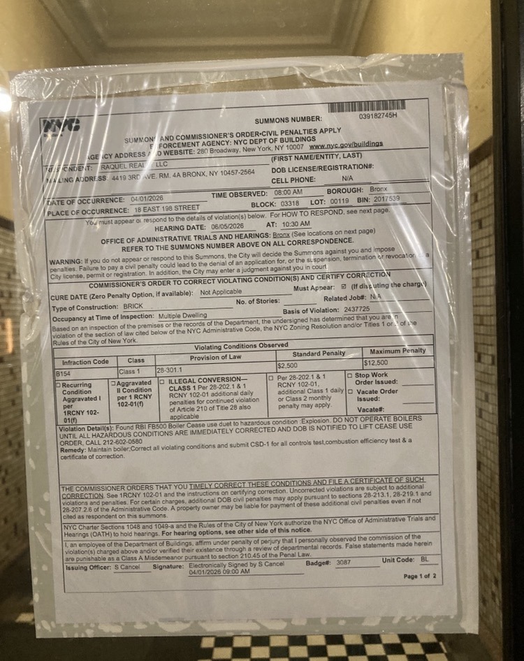 A DOB SUMMONS and penalty notice is seen affixed to the door of 18 E 198th Street in the Bedford Park section of The Bronx on Friday, April 3, 2026, three days after the FDNY were called to the location for an apparent gas explosion, prompting an evacuation.