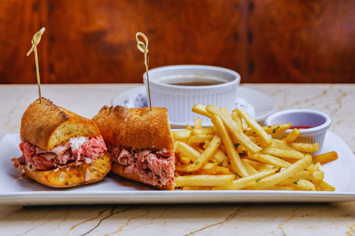 It’s not traditionally French, and yet it’s become something of an anchor here. Slow-roasted Black Angus beef layered onto toasted bread, served with au jus and a sharp roasted garlic–horseradish cream, with the option of Gruyère melting into everything.