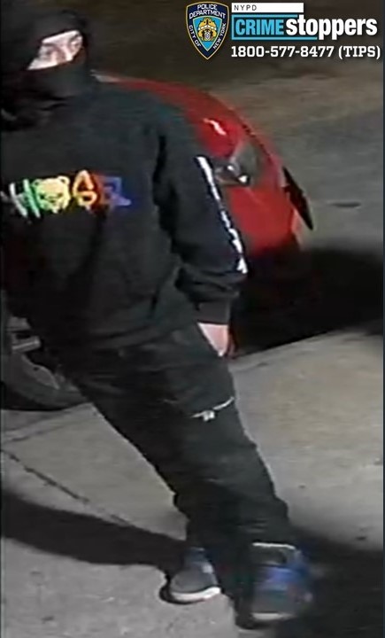 The NYPD released surveillance images of the suspects and described them as having light complexions. One wore a distinctive black hooded sweatshirt with a multi-colored design across the chest and white lettering on the sleeves, black pants, dark sneakers and a black face covering. The second assailant wore a black hooded sweatshirt, black pants and white sneakers. The third and fourth muggers appeared to be younger. One wore a black jacket, black sweatpants, white sneakers and a white baseball cap, while the other wore a black sweatshirt, black pants and black sneakers. The fifth suspect was the heaviest of the crew and wore a black jacket, black pants, white sneakers and a black baseball cap.