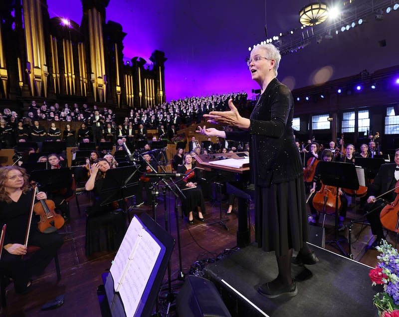 Jane Fjeldsted conducts the Davis County Interfaith Choir and Orchestra’s production of “Lamb of God” during a full dress rehearsal at the Salt Lake Tabernacle in Salt Lake City on Tuesday, March 17, 2026. | Jeffrey D. Allred for the Desere