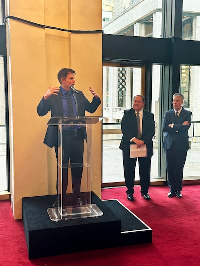 Composer and conductor Rob Gardner speaks at a reception before the “Lamb of God” concert at The Metropolitan Opera House at Lincoln Center in New York City on Monday, March 30, 2026. Also pictured are Elder Allen D. Hanie, General Authority Seventy and President of the United States Northeast Area, and Elder David Marriott, an Area Seventy, both of The Church of Jesus Christ of Latter-day Saints. | The Church of Jesus Christ of Latter-day Saints
