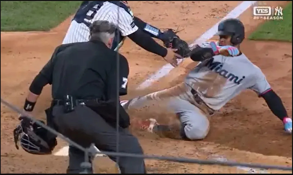 The Marlins got to Fried twice more in his outing, and were on the verge of tying things up when home plate umpire Manny Gonzalez calling Marlin Connor Norby safe on a contact play at home. Fortunately we have the benefit of review: