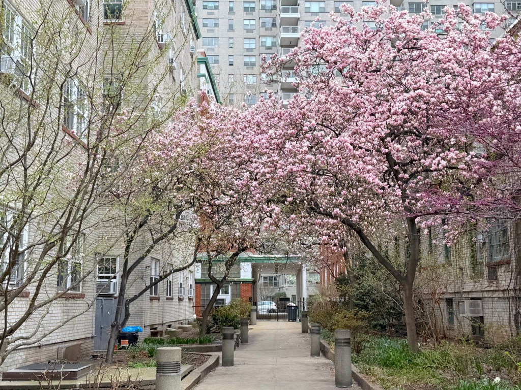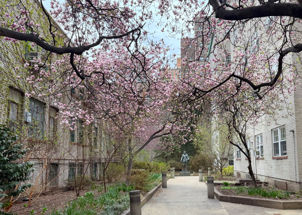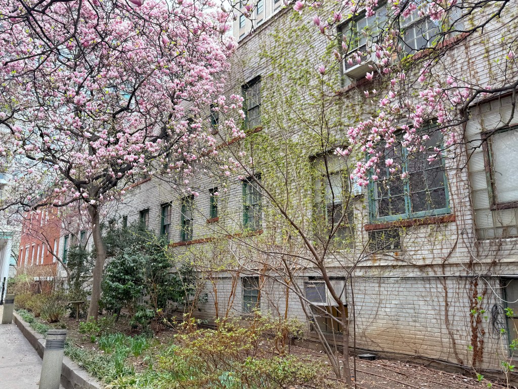 A canopy of pink and white petals overhead, patches of ivy crawling up walls, a couple of bird baths, bushes and flowers budding closer to the ground—it’s the kind of not overly manicured garden that reflects the Village’s historical refusal to adhere to convention (or the street grid).