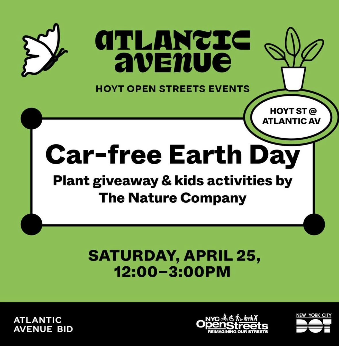 Join the Atlantic Avenue BID on Hoyt Street between Atlantic Avenue and State Street for their plant giveaway, kids activities and education by the Nature Company, and great vibes. Grab your friends and family and meet up on the open street.