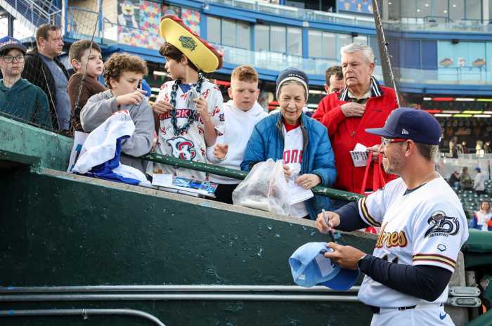 A Cyclones player connects with young fans while signing autographs ahead of opening day.Photo by Erica Price