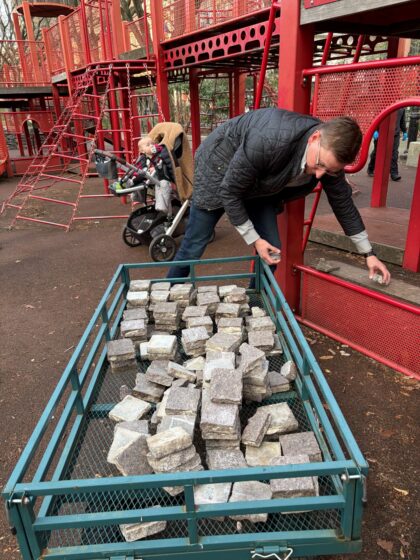 This is just ridiculous, that the parents and caregivers of these kids are allowing them — maybe even helping them — vandalize the park. It is then left to either the Friends or the Parks Department to repair it, and thousands have gone into that already. (Below, a dad and park worker gather the pavers for safekeeping.)