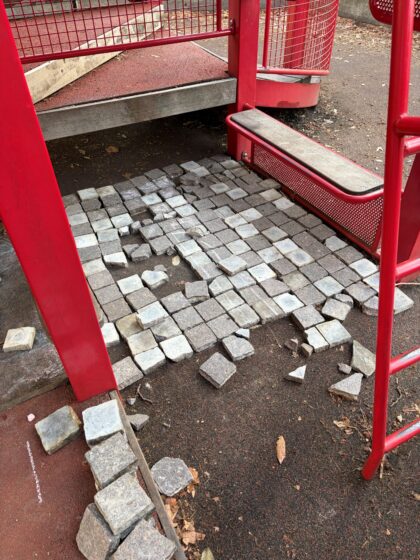 “It’s disappointing to see the pavers being pulled up and scattered throughout the park and playground, but what makes it especially hard is watching it happen in plain sight of parents and caregivers who aren’t stepping in,” said Amandalyn Jones from the Friends. “So many people give their time and energy to this park — volunteers, neighbors, and community members — and we owe it to each other to help protect it.”