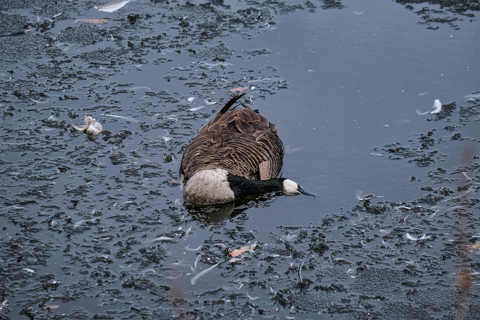 A dead Canada goose (Branta canadensis) floats in New York City’s Central Park Reservoir in early March 2026. Twenty-one geese were seen dead in the reservoir that day. Public health officials warn against people handling sick or dead animals. Image by Cate Twining-Ward.