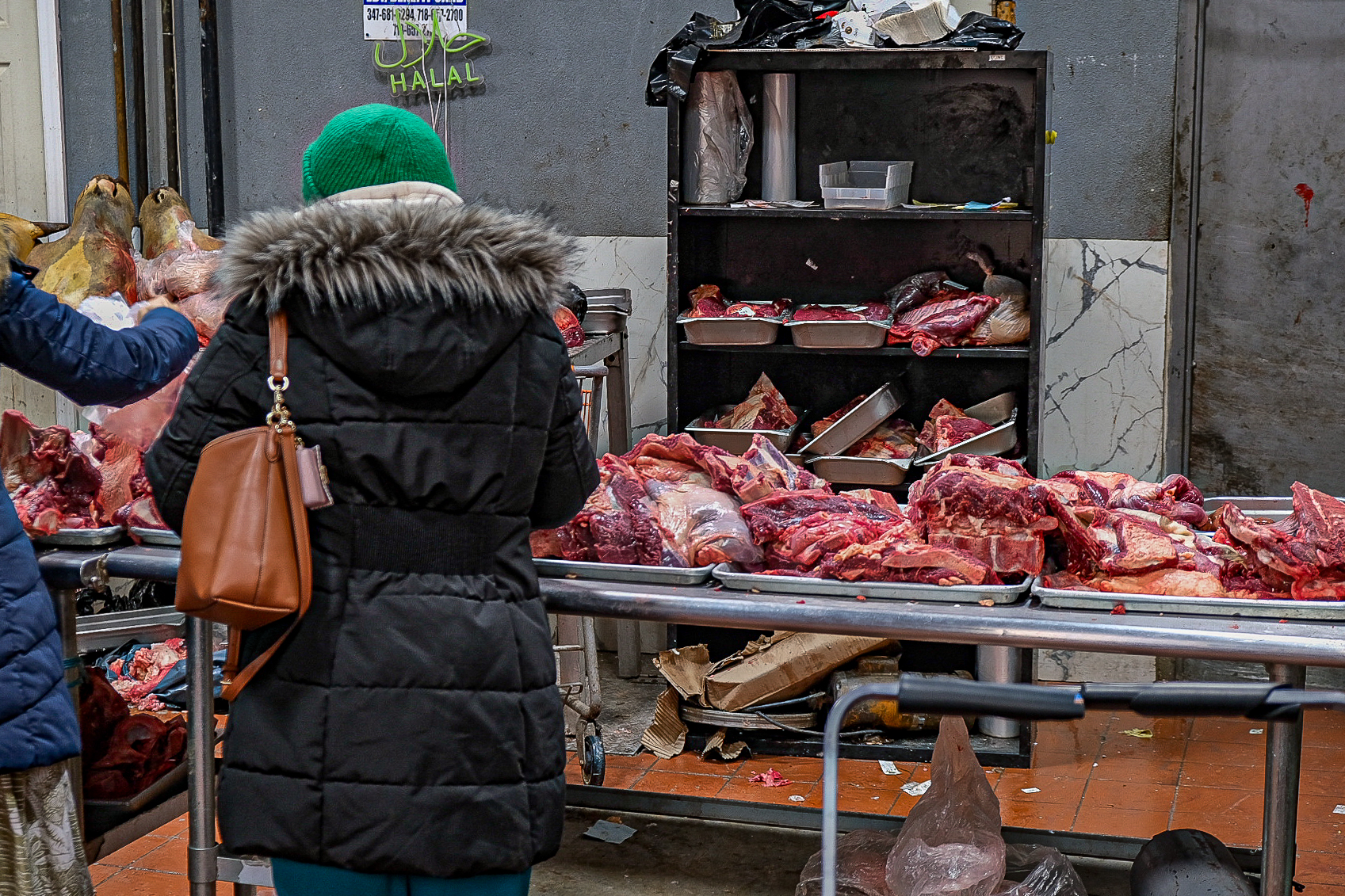 Cuts of mammal meat and organs are laid out for sale at a market in Jamaica, Queens, where customers sort through them using plastic bags over their hands. Image by Cate Twining-Ward.