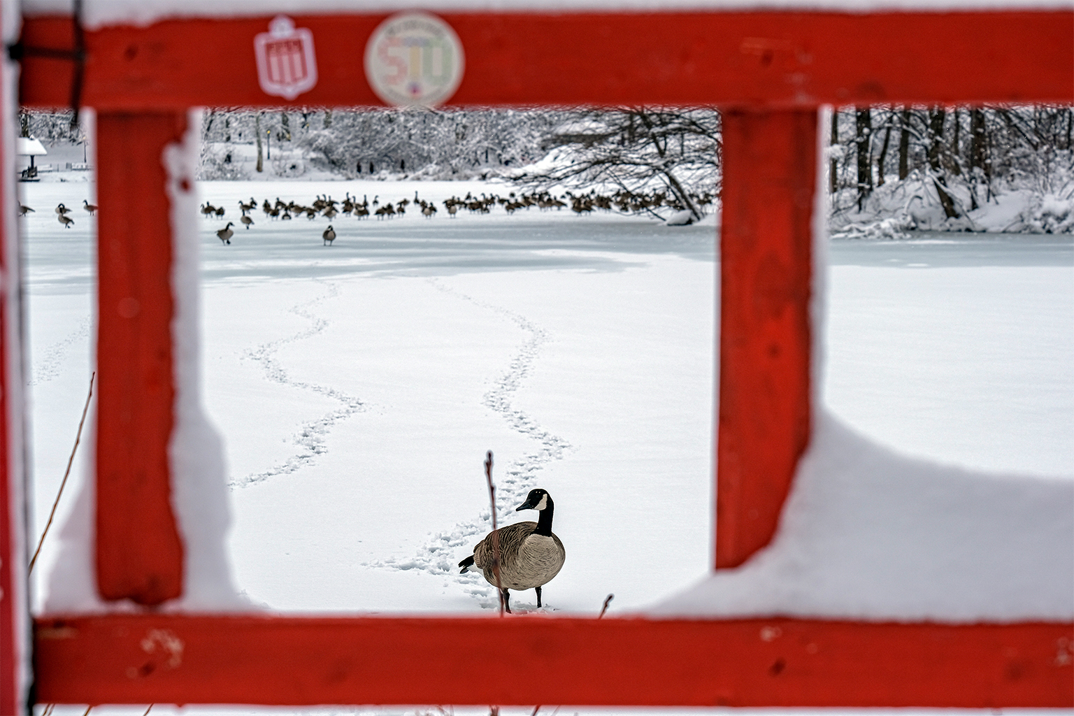 Canada geese cluster on a frozen lake in Central Park during a cold front in New York City. Like cities the world over, New York is host to a wide variety of migratory bird species. Image by Cate Twining-Ward.