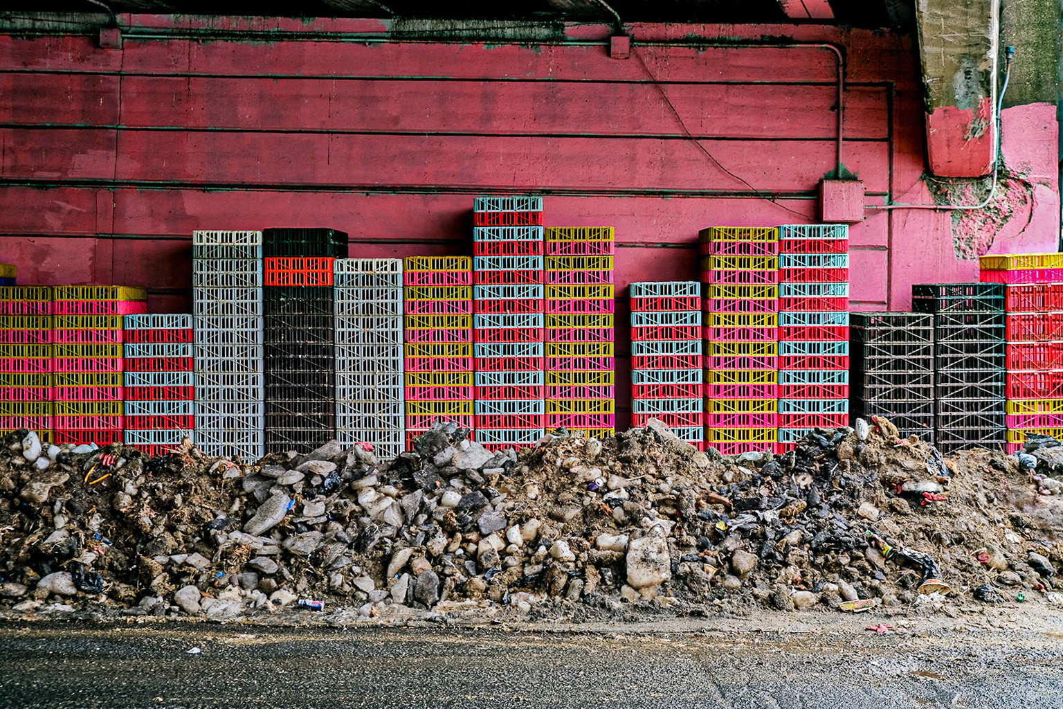 Bird crates stacked outside a live poultry market in Jamaica, Queens, where feces and runoff seep into the street and mix with snow. Image by Cate Twining-Ward.