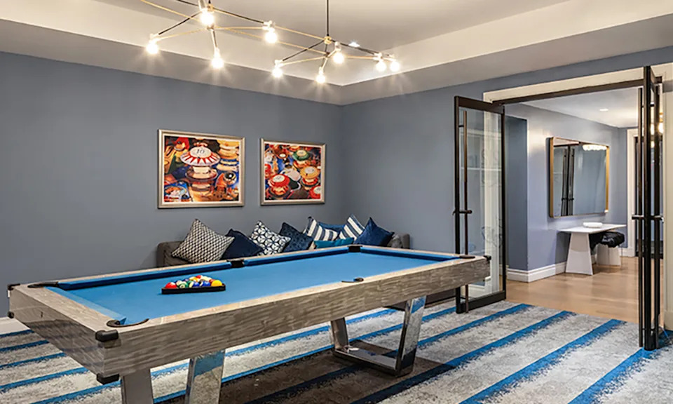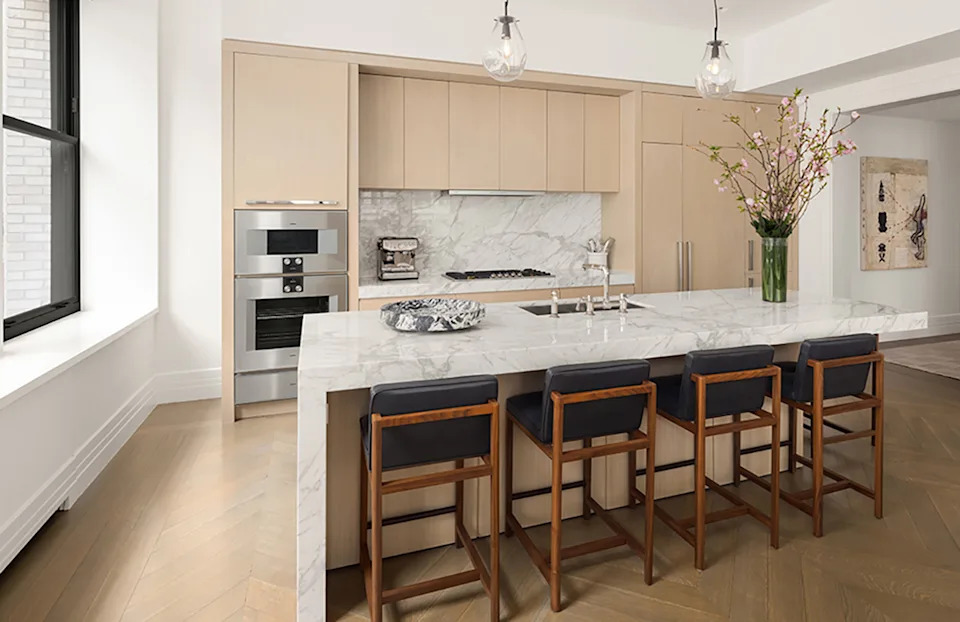 The eat-in kitchen comes with a waterfall island and Gaggenau appliances.
