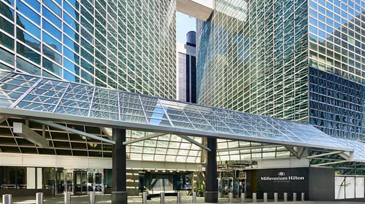The entrance to the Millennium Hilton.