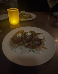 I come from a family that loves to have funky drinks and order pragmatically off the menu to share. Grilled homemade pierogi and Buffalo-tossed cauliflower and sprouts felt like getting a love letter from home.