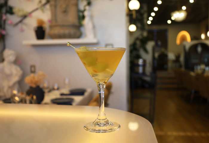 A dirty martini sits on the stone bar of the newly opened Silent Sea — an upscale Greek restaurant. Photo by ET Rodriguez