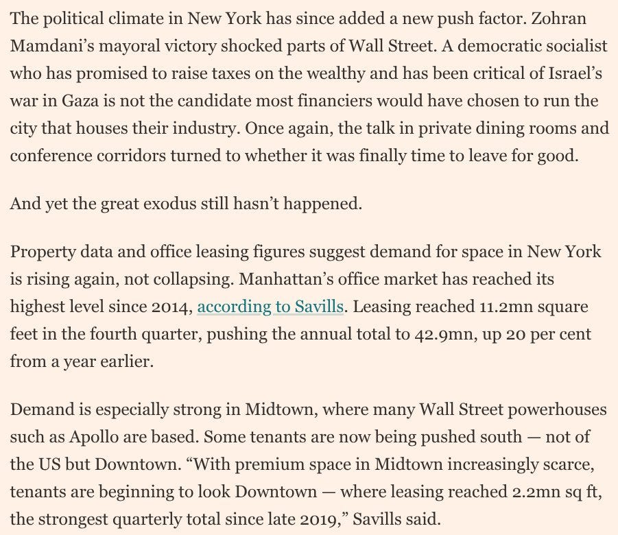 The article referenced a Savills office research piece for 4Q25 with the headline: Manhattan ends strongest leasing year in a decade with a high-performing fourth quarter. Inventory is down, and prices are rising.