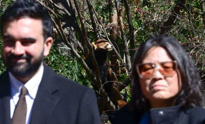 A red panda peers out between Mayor Mamdani and Deputy Mayor Julie Su. Photo by Lloyd Mitchell