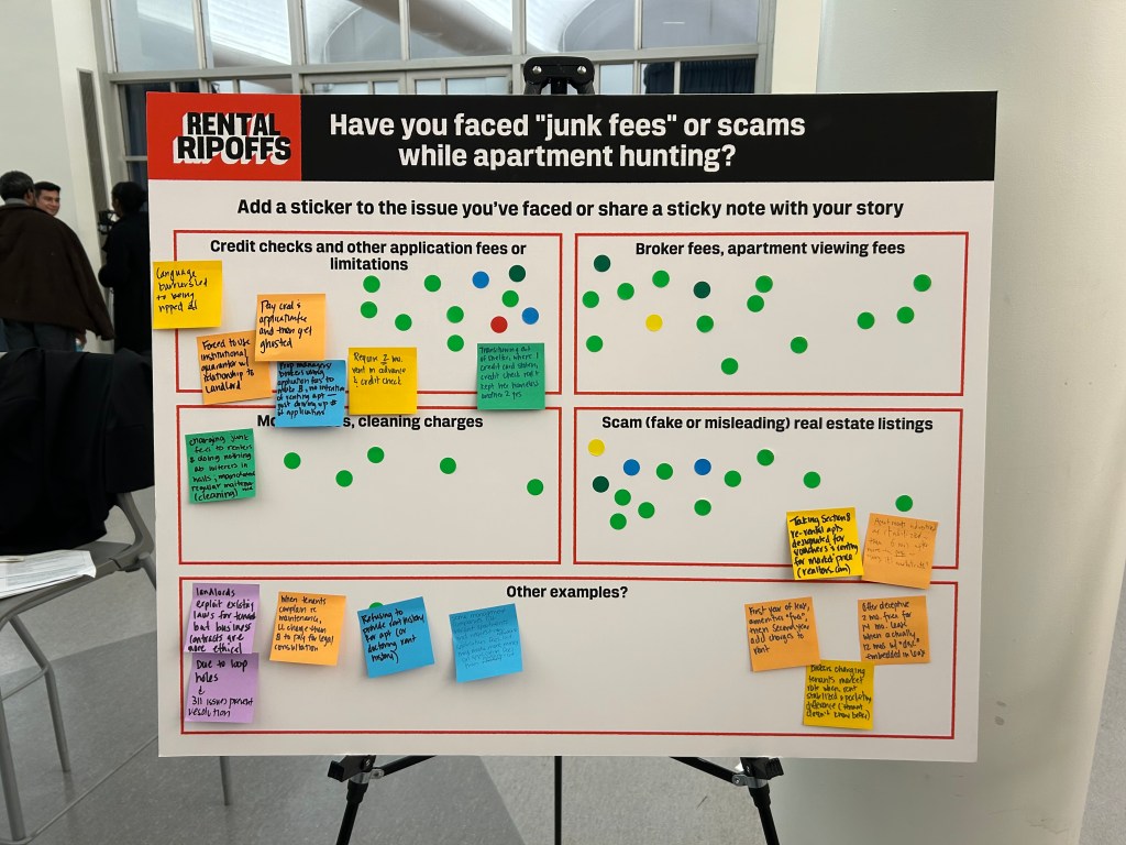 Arrayed around the room were posterboards, which not only asked tenants what problems they faced but sought their input on policy proposals brainstormed by staff, like fining landlords who don’t make repairs, making it easier to form tenant unions, or enabling the city to take over buildings when there are serial violations. Placing a sticker by the proposal signaled approval. But in addition, the public could also write their own policy alternatives on Post-It notes. And they did.