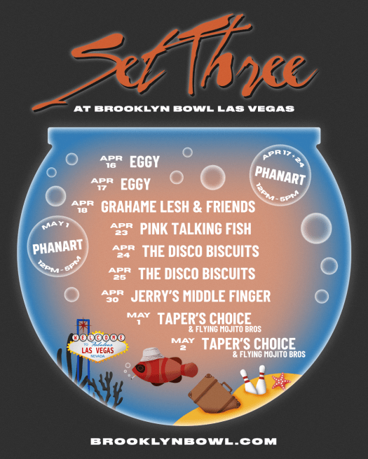 [Sponsored]: After Phish fans are through floating in the blimp a lot at Sphere, the shows will go on with nightly afterparties at Brooklyn Bowl Las Vegas. The series, dubbed Set Three, will feature late-night shows from The Disco Biscuits, Grahame Lesh & Friends, Eggy, Taper’s Choice, and others, plus free daytime fun from PhanArt [get tickets].