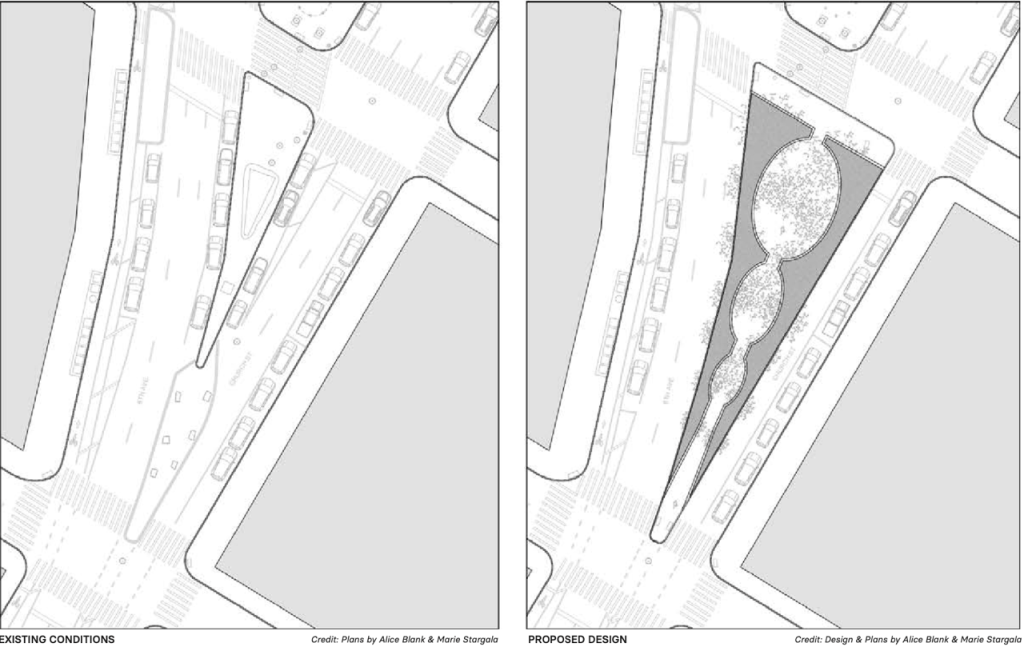 On the left, Barnett Newman Triangle as it currently exists. On the right, a vision for it that adds green space (the grayed areas) to create one center-running path.