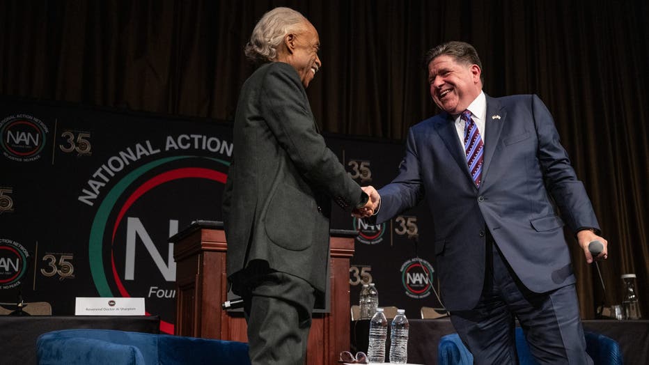 Reverend Al Sharpton, founder and president of the National Action Network, left, and JB Pritzker, governor of Illinois, shake hands during the National Action Network (NAN) 35th Anniversary Convention in New York, US, on Thursday, April 9, 2026. A h