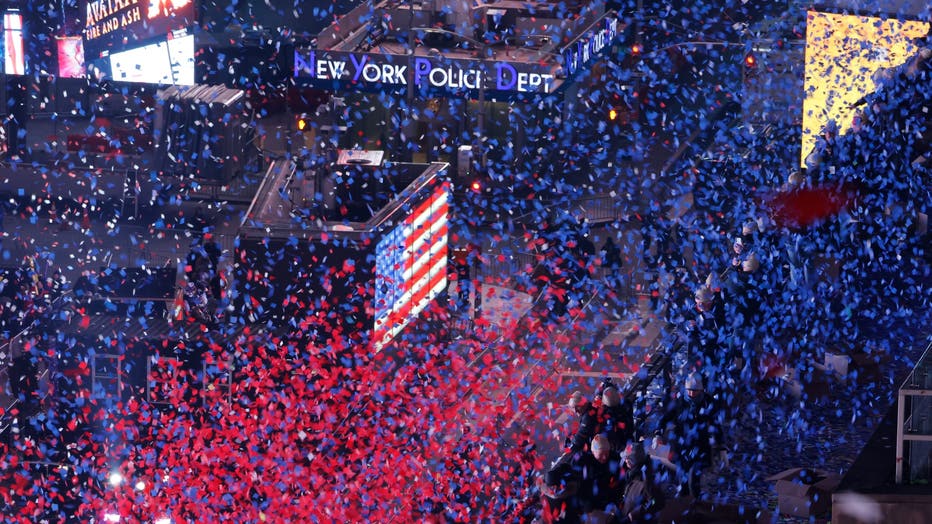 NEW YORK, NY – JANUARY 1: Red, white and blue confetti falls on revelers during a second ball drop to mark the start of the America250 semiquincentennial celebration year during New Year’s Eve festivities in Times Square on January 1, 2026, in New Yo