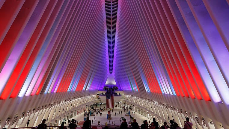 NEW YORK, NY – JULY 4: The Oculus transit hub is illuminated in red, white, and blue to mark Independence Day on July 4, 2025, in New York City. (Photo by Gary Hershorn/Getty Images)