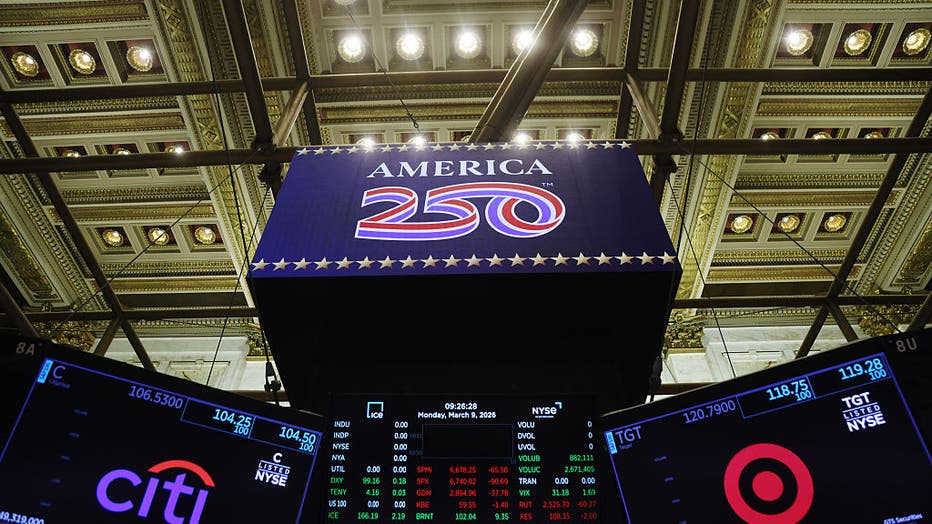 America 250 signage on the floor at the New York Stock Exchange (NYSE) in New York, US, on Monday, March 9, 2026. The war in the Middle East sparked fresh turmoil in global markets as oil smashed through $100 a barrel, spurring losses in stocks and b