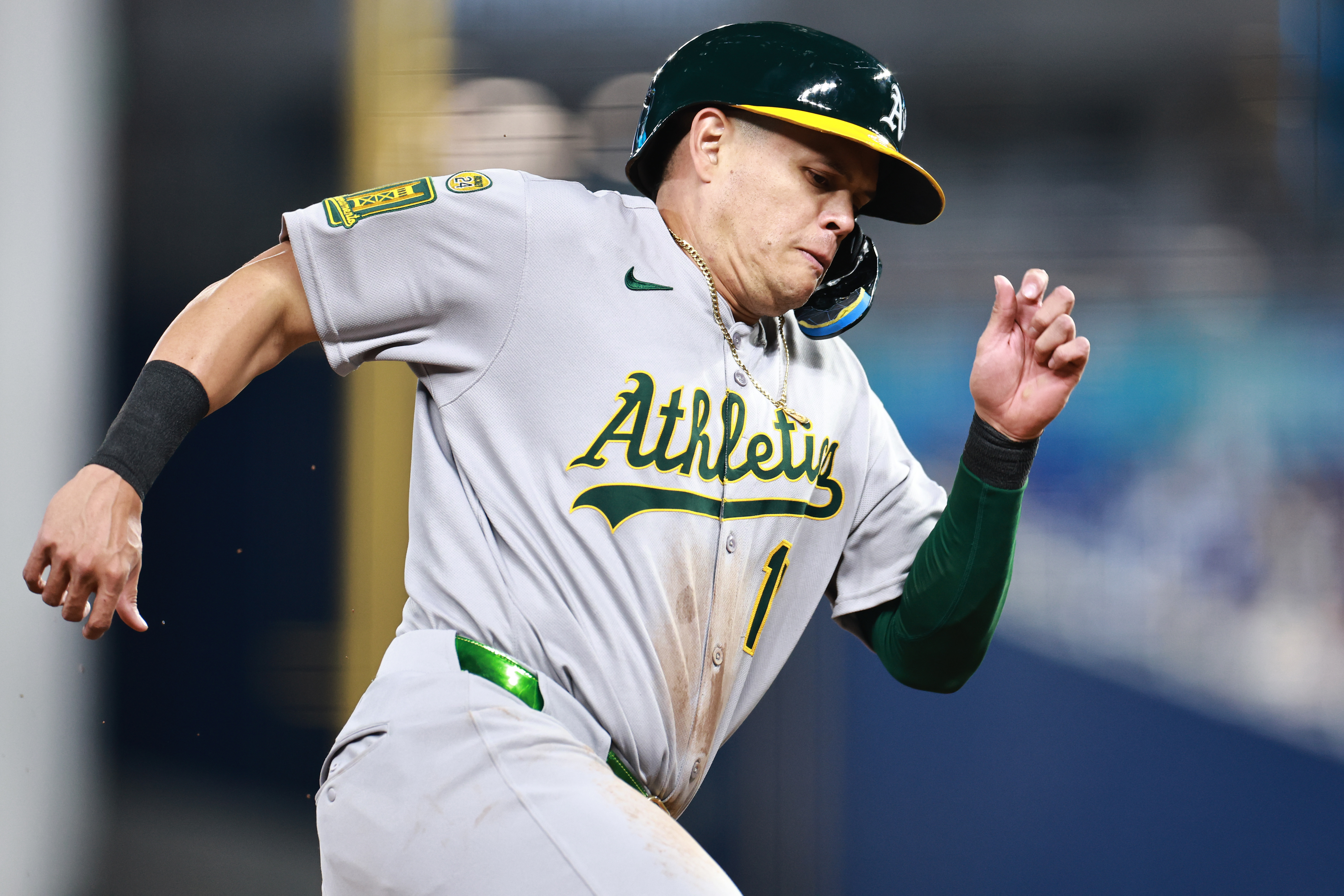 GettyGio Urshela #13 of the Oakland Athletics rounds third before being tagged out at home plate by Nick Fortes #4 of the Miami Marlins during the second inning at loanDepot park on May 04, 2025 in Miami, Florida.