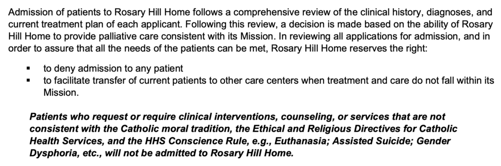 They nuns also take issue with requisite Affirming Care for Older LGBTQIA+ Individuals Online training, as per a NYS Dept. of Health “Dear Nursing Home Administrators… ” letter attached to the lawsuit. The are not shy about their position: application to Rosary Hill states up front that they will not accept requests unless they are “consistent with the Catholic moral tradition.”
