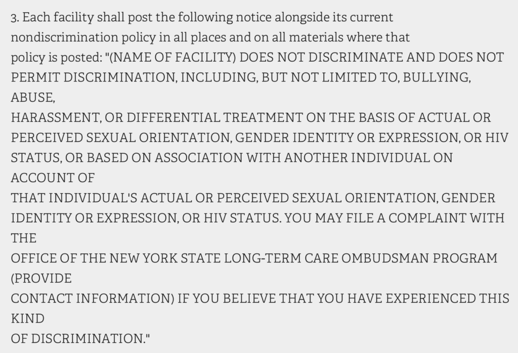 Image: post mandate portion of SECTION 2803-C-2 “LGBT and people living with HIV long-term care facility residents’ bill of rights” via New York State Senate
