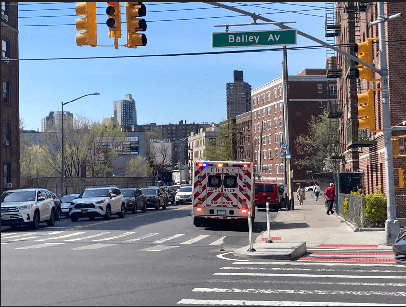 AN AMBULANCE IS seen on the corner of West 238th Street and Bailey Avenue in the Kingsbridge section of The Bronx on Sunday afternoon, April 12, 2026.