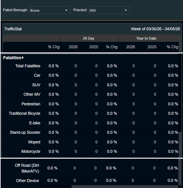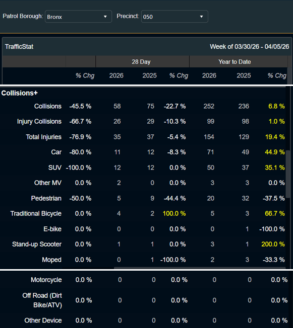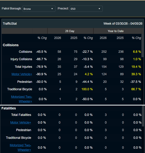 TRAFFIC ACCIDENT STATISTICS in the 50th Precinct, where this accident occurred, for the 28-day period ending April 5, 2026 compared to last year (left), and year-to-date traffic accidents in the 50th Precinct as of April 5, 2026 compared to last year (right) Part III. This precinct covers some or all of Kingsbridge, Fieldston, iverdale, Marble Hill, and Spuyten Duyvil.