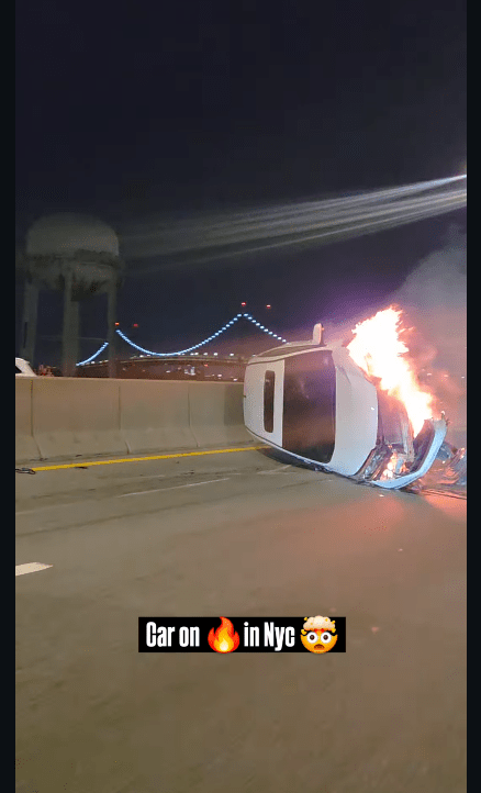 ACCORDING TO INSTAGRAM user, @kidelectrik, this car was seen overturned and in flames on the Major Deegan Expressway, just before the RFK bridge in The Bronx on Saturday night, April 11, 2026.