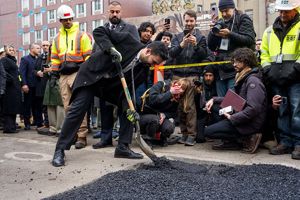 Mamdani using a spade to fill the Williamsburg Bridge bump. (Adam Gray / Bloomberg via Getty Images)