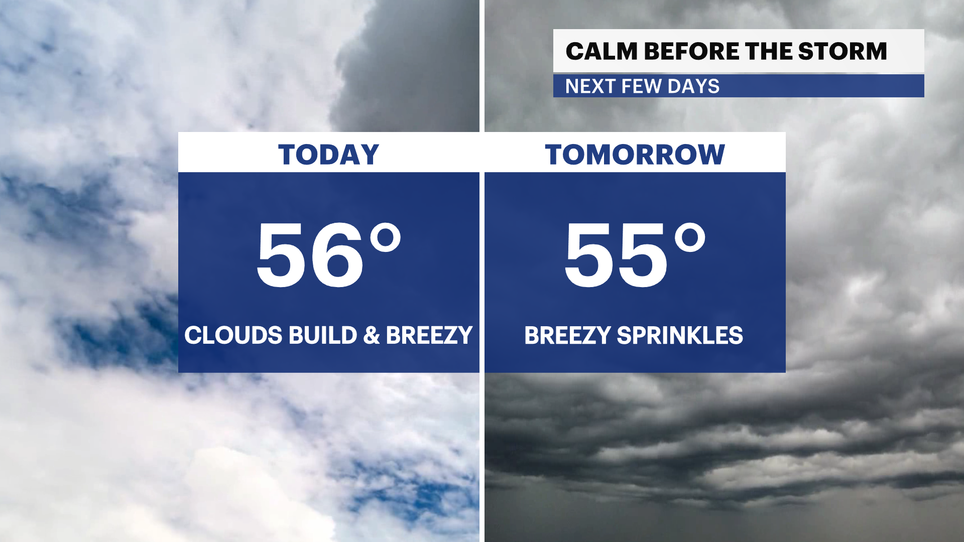 Clouds build on Wednesday with windy conditions and spotty sprinkles.