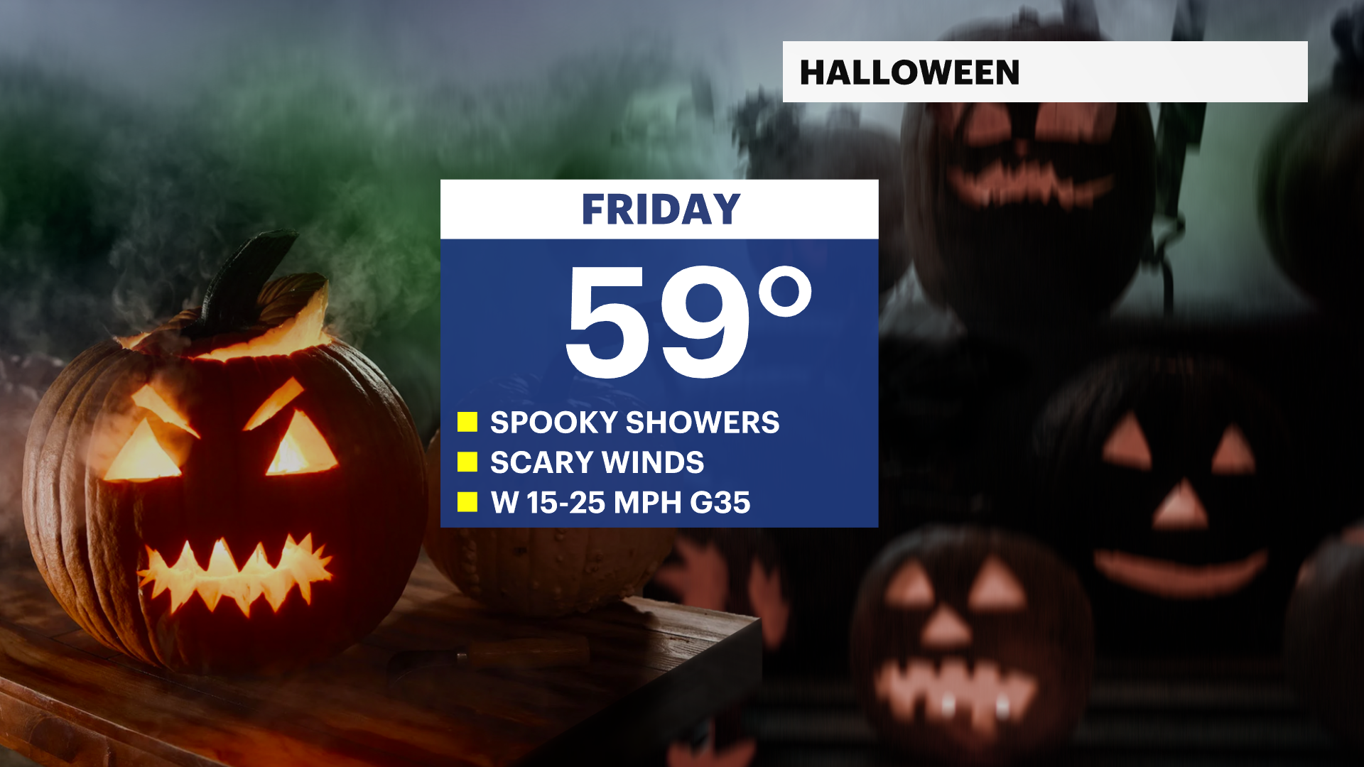 Friday (Halloween): Chance of morning breezy showers. Still cool with a gradual clearing sky. Gusty. Highs near 58. Lows near 48.
