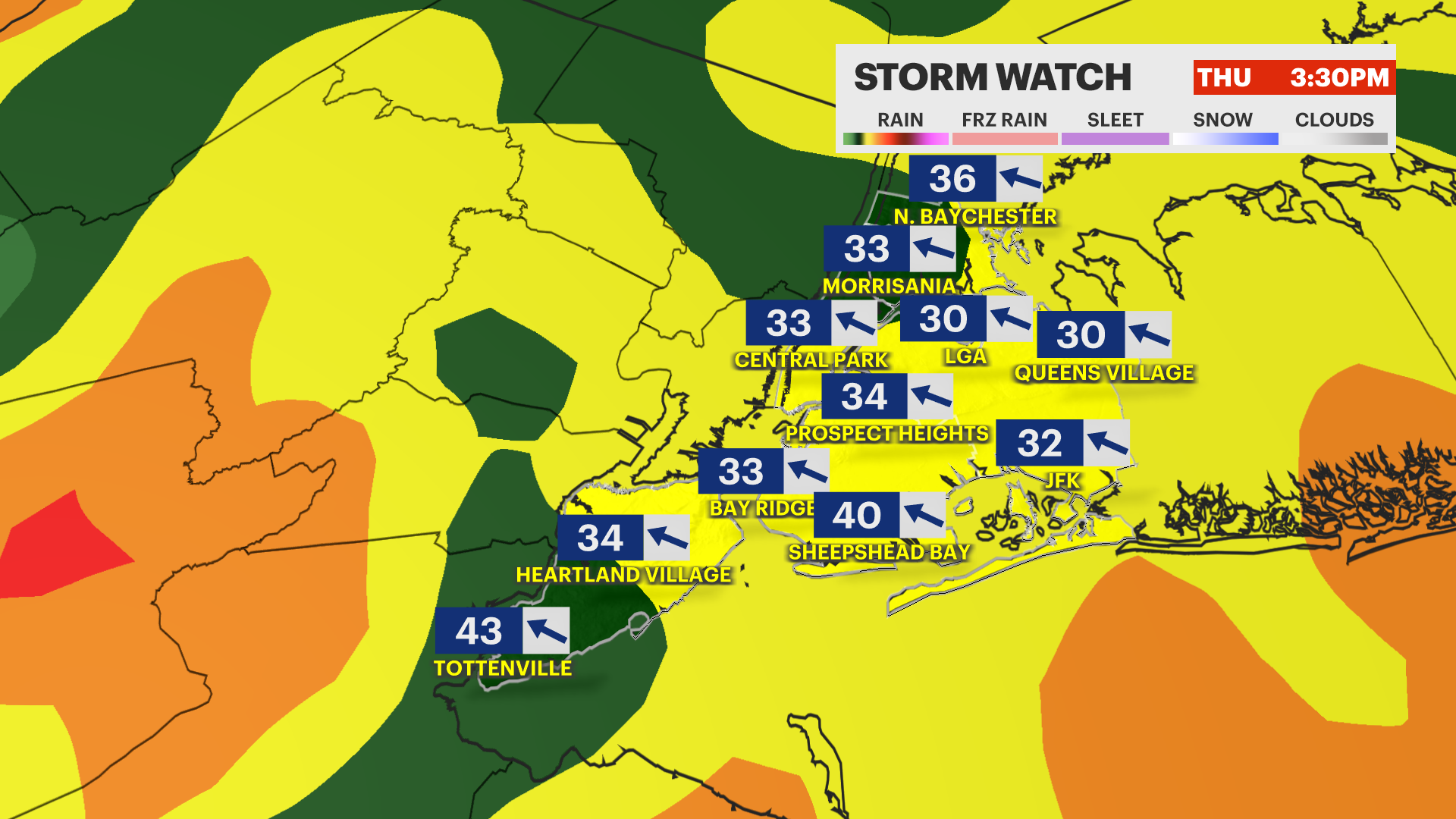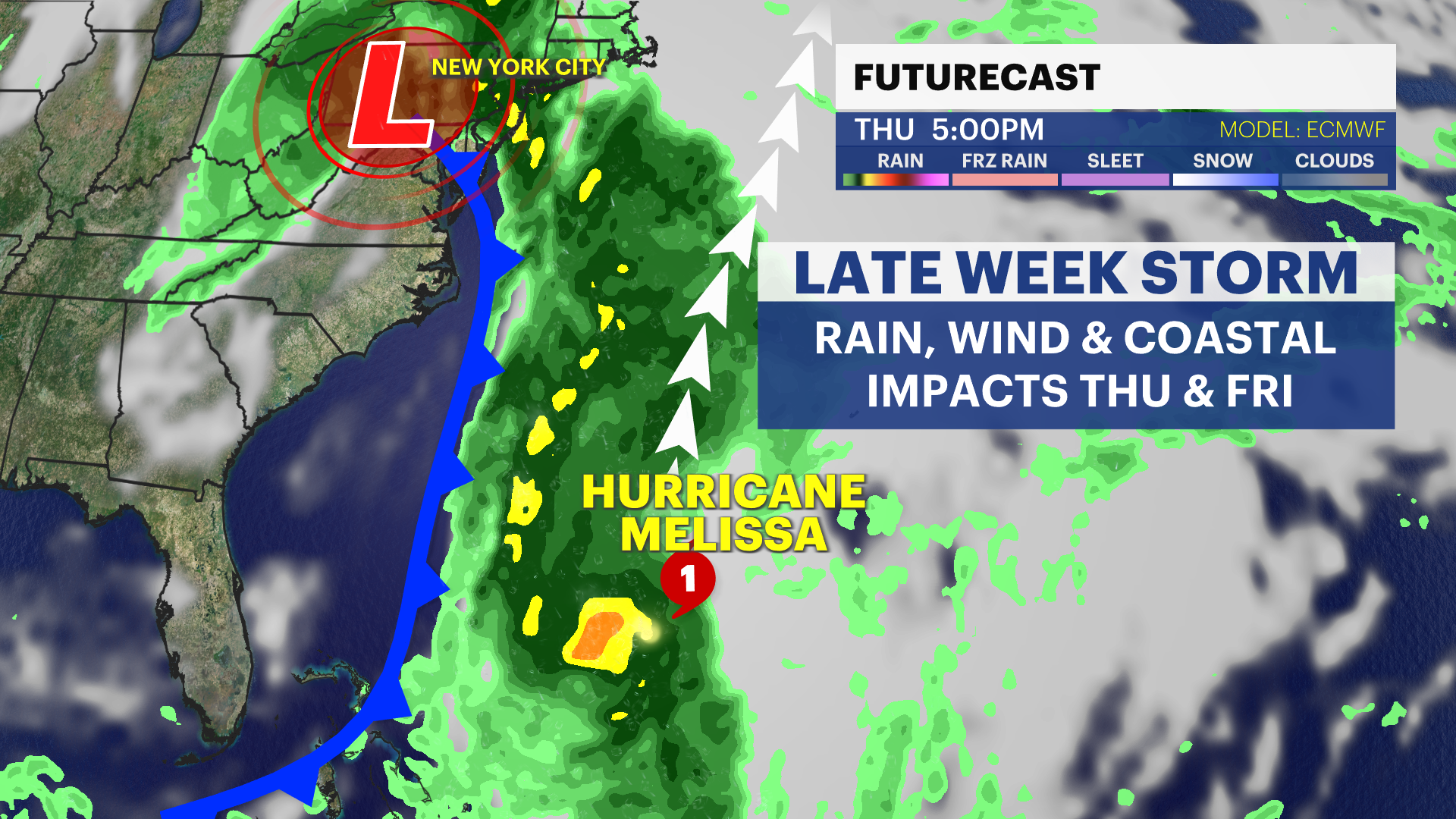 A strong storm system will approach the city from Southeast to Northeast starting overnight Wednesday through Friday. This storm will bring waves of moderate to heavy rain and a persistent gusty wind through the end of this week. The strongest gusts will be at the coast near 50 MPH. The worst of the storm will be Thursday afternoon and evening when the storm will be closest to the city. This storm system will interact with Hurricane Melissa and enhance how much rain we’ll receive. 1 to 3 inches of rainfall is possible through Friday with gusts up to 45 MPH+. The storm pulls away Friday morning, but gusty winds stick around through the weekend. Stay tuned for updates.