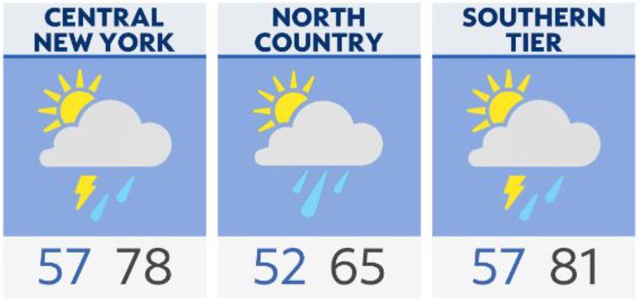 Afternoon highs will reach the middle to upper 70s around Syracuse and across the Southern Tier. Temperatures in the North Country will reach the 60s.