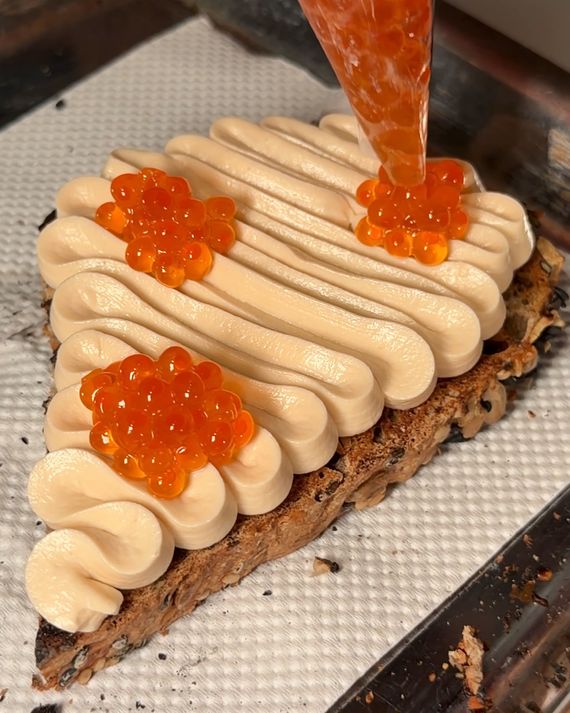 Trout mousse squiggled on top of large sourdough triangles, like an appetizing shop’s take on a petit four, dotted with a few orbs of roe.