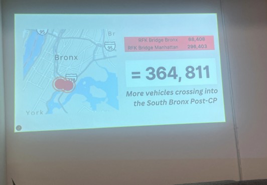 During the presentation, Tulloch mentioned the increased number of cars entering the South Bronx. The environmental justice educator at the non-profit looked at the MTA data showing monthly traffic on New York City’s bridges. She said that monitors on the RFK Bridge near Manhattan and near the Bronx both recorded an increase in traffic in 2025 compared to 2024, compared to 2024, with 364,811 more cars than the year before, when congestion pricing was not in effect.