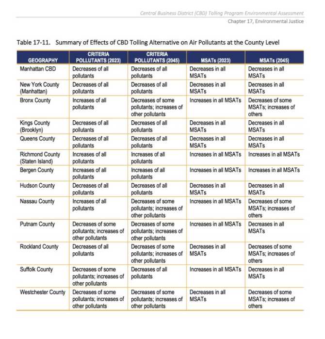 The MTA also found that with the implementation of the CBD Tolling Alternative, traffic patterns would shift because of drivers who divert to avoid the new toll. It also predicted an increase of all air pollutants for the Bronx.