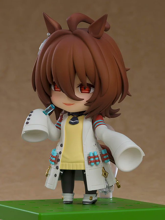 These rereleases are identical to the originals. Each character comes with three face plates based on their expressions in the game. Agnes Tachyon comes with a test tube she can hold, while Manhattan Cafe includes a coffee mug as her accessory. Both feature a base that looks like turf and the race track with the guard rail.Â