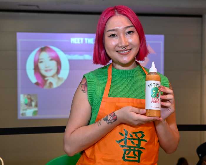 Christina Wu and Alex Matos of Kemushi Sauce, a company inspired by Japanese culinary traditions, featuring condiments like spicy mayo, umami soy sauce and unagi sauce.