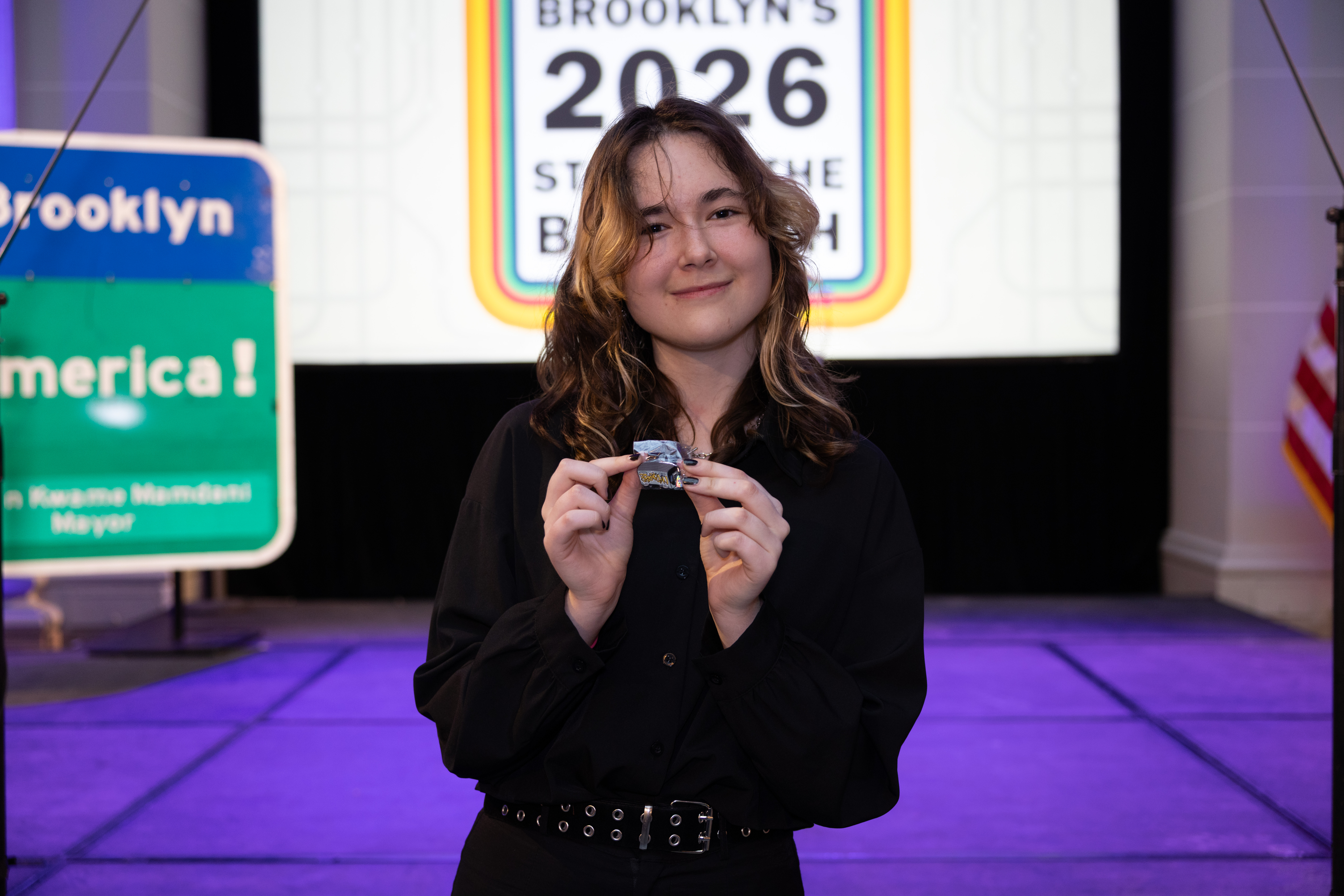 The winner of the 2026 Brooklyn Pin Design Contest. Photo: Joel Cruz/Office of the Brooklyn Borough President