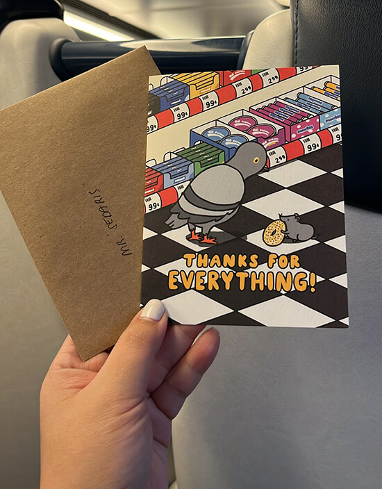 The next day, Catherine and I went to Penn Station and got on the NJ Transit train to Morristown. As the train started moving, I brought out the card I had gotten for David. On the front is a little mouse clutching a bagel, looking up at a pigeon. They’re in the middle of what I assume to be an unusually clean New York bodega. Beneath them, in yellow letters: “Thanks for everything!”